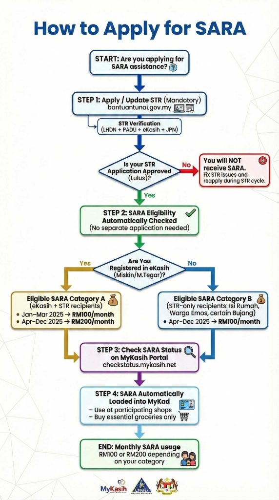 Only approved STR 2025 recipients in specific categories are eligible for SARA. Households listed under eKasih receive the highest tier, while non-eKasih STR recipients receive the standard tier.
