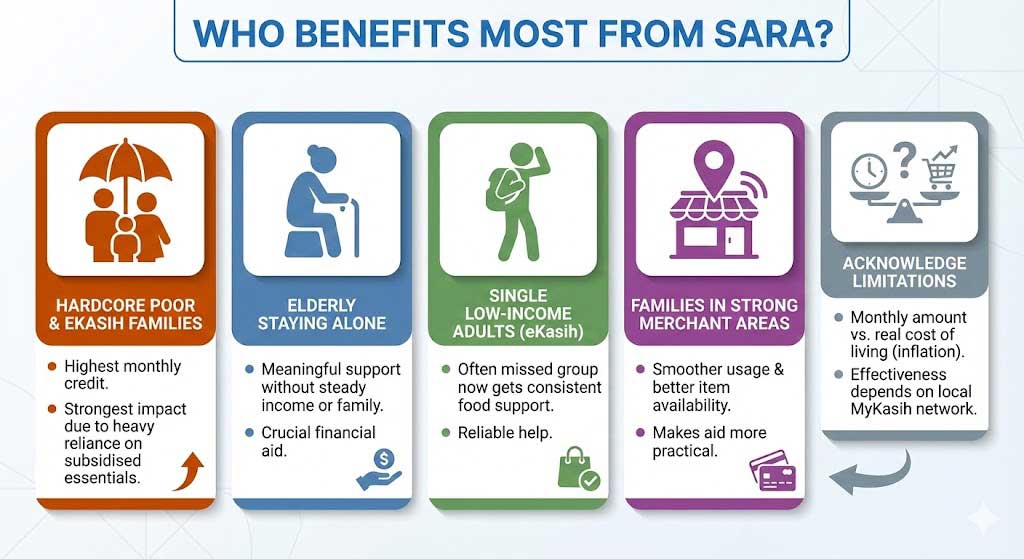 While SARA is often described as bantuan for “B40,” the groups that benefit most are far more specific. The hardcore poor and eKasih-registered families feel the strongest impact because they receive the highest monthly credit and rely heavily on subsidised essentials. Elderly individuals living alone also gain meaningful support, especially when they lack steady income or family assistance. Single low-income adults in eKasih—a group often missed by other aid programmes—finally receive consistent food support through SARA. Households in areas with strong MyKasih merchant coverage experience smoother usage and better item availability, making the aid more practical. Still, it’s important to recognise limitations: monthly allocations may not fully match rising living costs, and effectiveness depends heavily on how well each region is served by the MyKasih retail network.